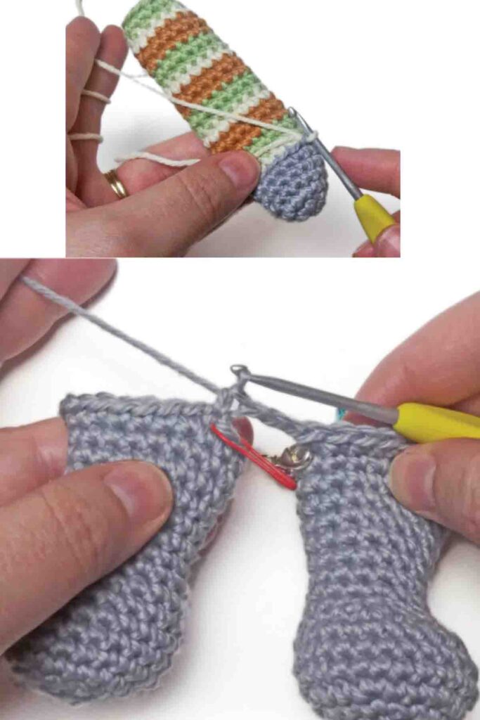- For the second leg: Repeat Rnds 1-17, mark the 17th st with a marker, but do not fasten off. Continue to the body.
