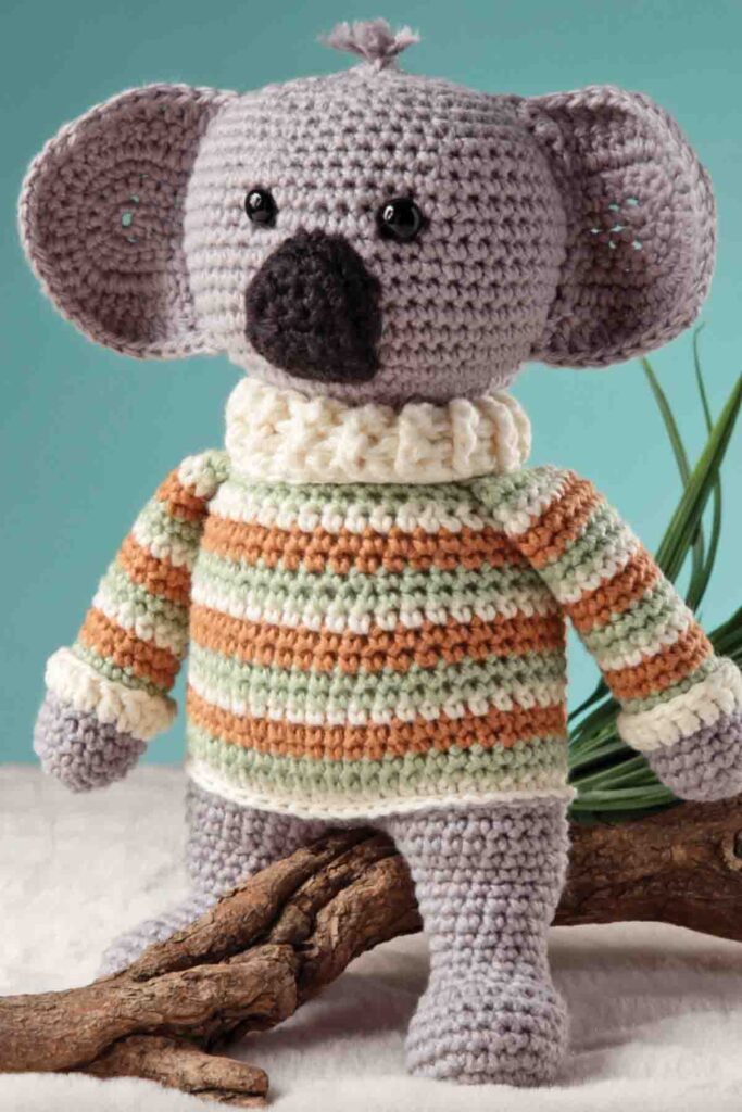 This adorable amigurumi koala stands about 9 inches (23 cm) tall and features a cozy cowl, striped arms, and a charming personality.